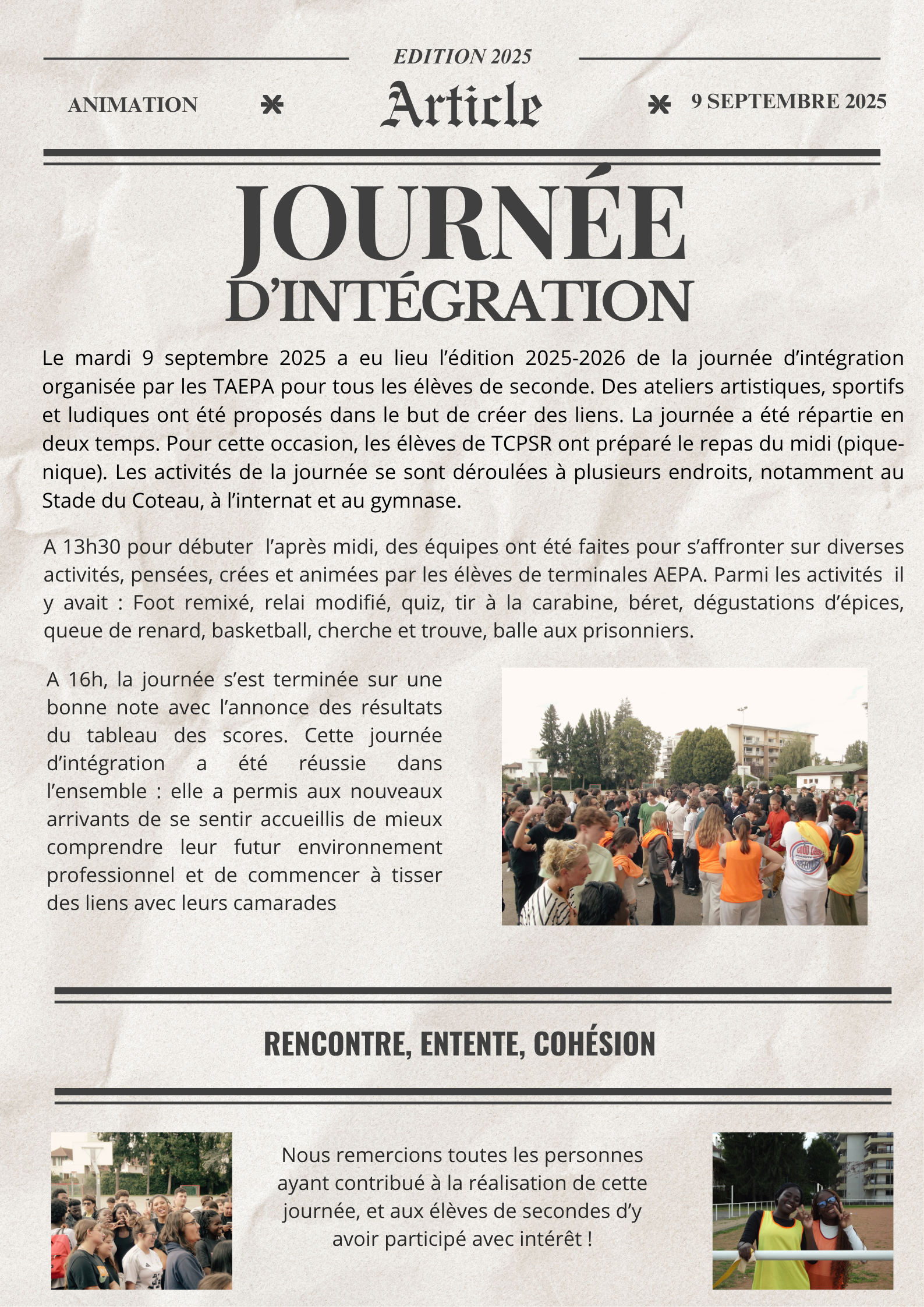 Le 9 septembre 2025, les TAEPA ont organisé la journée d’intégration des secondes avec des activités artistiques, sportives et ludiques.