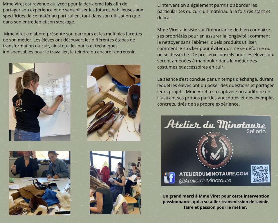 Ce mercredi, les élèves de Terminale Technicien du Spectacle option Habillage ont accueillir Mme Viret de l'Atelier du Minotaure, une professionnelle du cuir pour une intervention riche en enseignements.